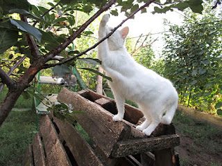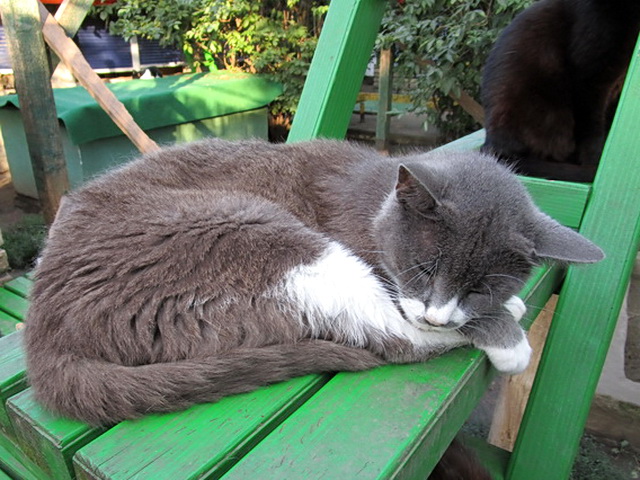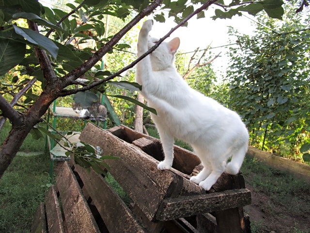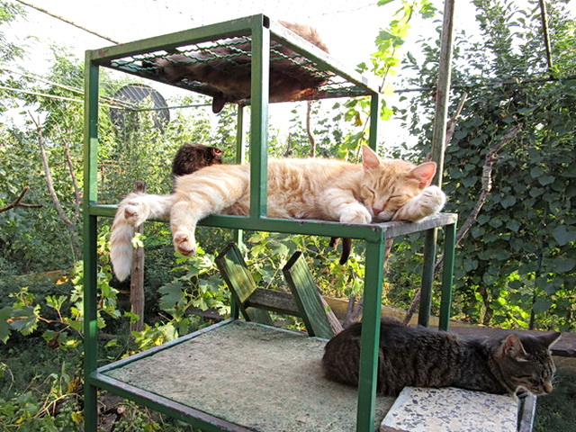 the rotten wooden platforms and boards in the yard were replaced and the new ladders were made. As most of the cats which had been shedding abundantly for months were not able to replenish their fur because of a low quality diet, we began feeding them better